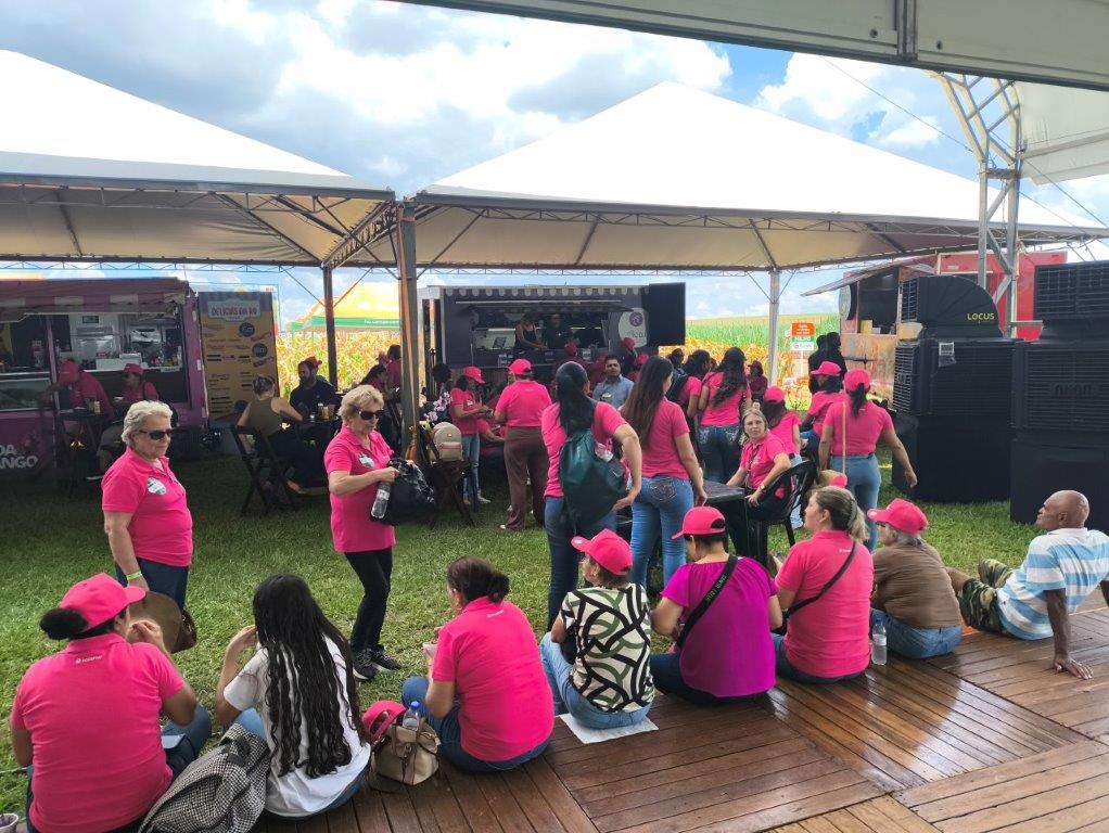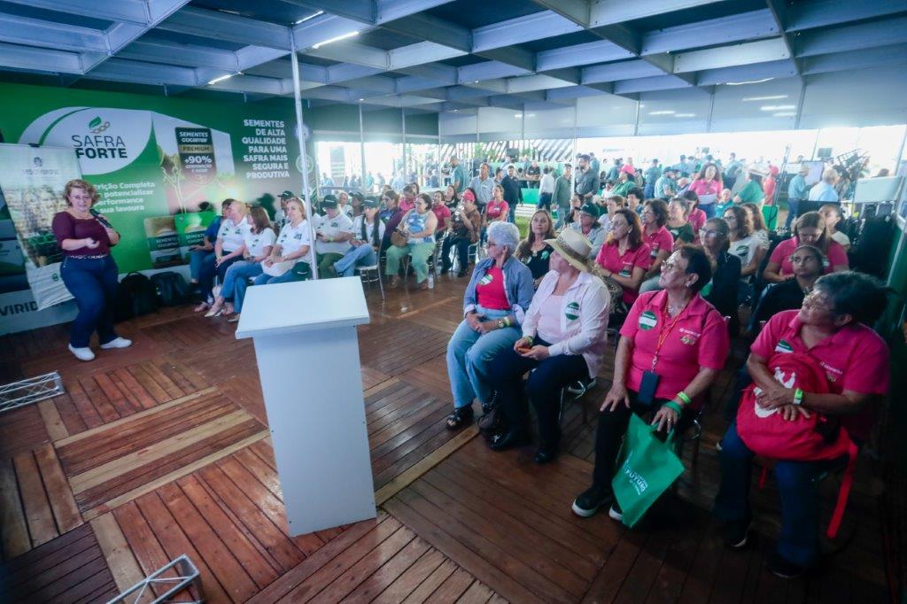 PRODUTORAS – Além de palestras programadas com especialistas sobre temas diversos durante os dois primeiros dias no Auditório do Conhecimento, no sábado o Safratec recebeu centenas de cooperadas de várias regiões para o já tradicional Encontro de Produtoras. Alcilene, esposa do cooperado Claudecir Verdério, que produz limão, soja e milho e cria gado em Paraíso do Norte, acompanhou de perto as palestras no Auditório do Conhecimento, citando que faz questão de se manter a par do que há de novo na agricultura e na gestão da propriedade. Exemplo seguido pelas filhas Bruna e Olívia, especialmente a segunda, que acompanha o pai em todas as atividades no sítio e está cursando Agronomia.