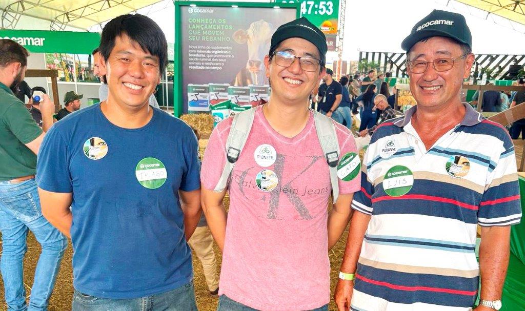 REPERCUSSÃO – Produtor que sempre prestigia os eventos da Cocamar, Luiz Takumi Shigueoka, de Assaí (PR), município onde produz grãos e café, compareceu ao Safratec acompanhado de dois filhos: Thiago, engenheiro agrônomo, e Caio, que cursa odontologia. “A gente não pode perder realizações como essa, são muitas as novidades”, afirma Luiz, que pretendia conhecer, principalmente, cultivares mais produtivos de soja. Também em busca de novas tecnologias e conhecimentos, Rosângela e Ademir Embriane, que cultivam soja e milho em Astorga, visitaram os diversos trabalhos apresentados pela Cocamar e parceiros e trocaram ideias com outros produtores.